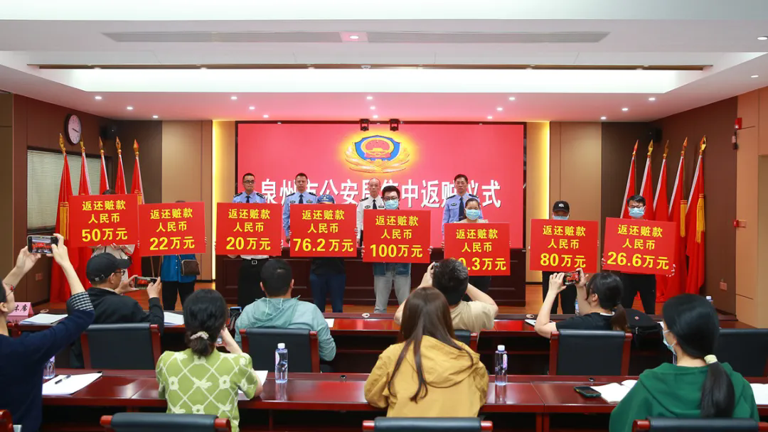 刑侦支队支队长邱鑫通报了“5.27”电信网络诈骗和丰泽“套路搬”两起专案侦破情况;市反诈骗中心主任陈焕林作了电信网络诈骗防范提醒。现场还举行了返赃仪式,分批次为受害者发还被骗钱款。