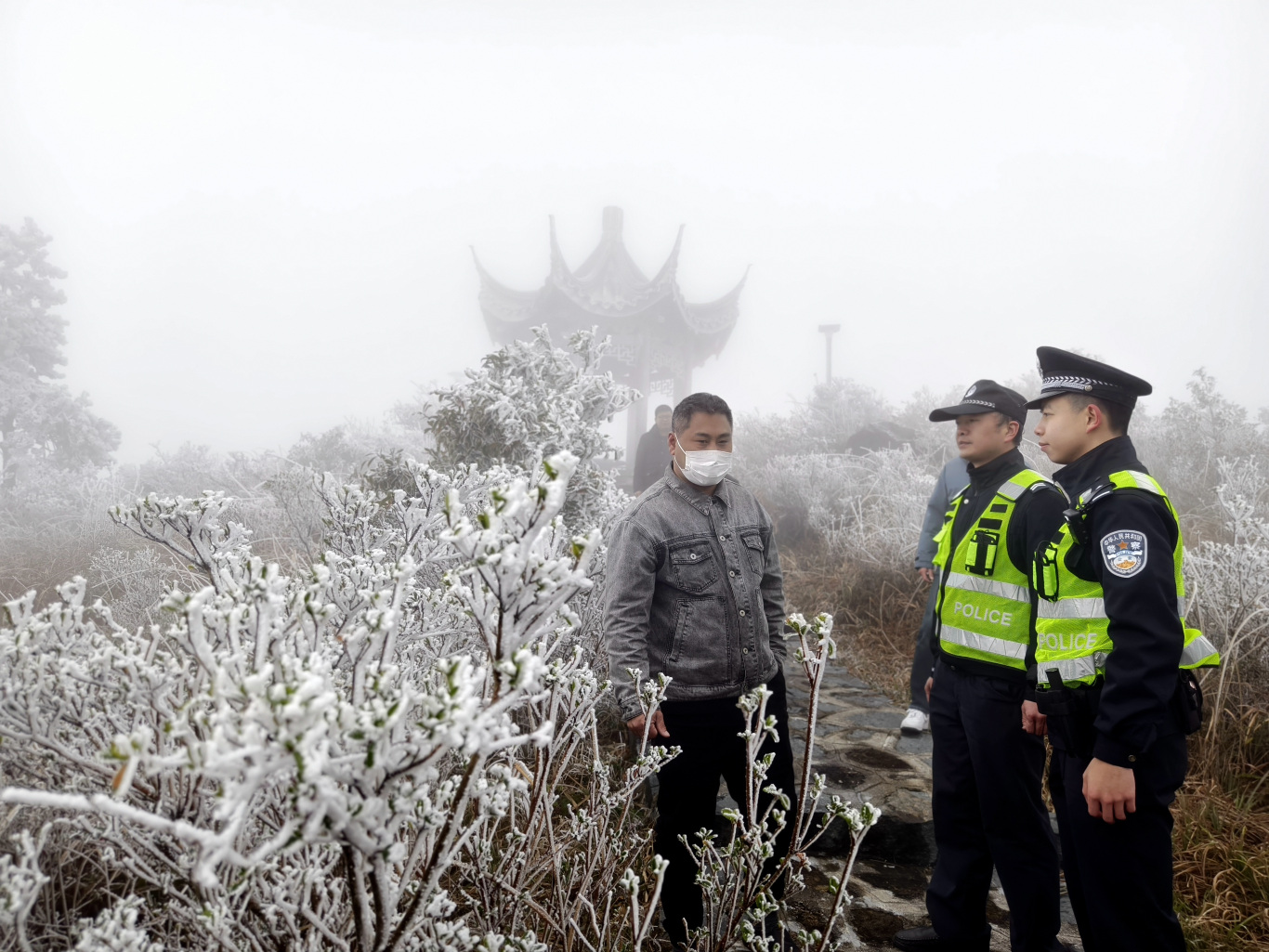 佛耳山雾凇景观是安溪冬季旅游名片,每到观赏旺季,游客络绎不绝。为守护游客安全,安溪祥华派出所制定专项安保方案,组建专项安保小组。针对景区弯道多、陡坡密、冬季路面易结冰的特点,安保小组每天清晨巡查重点路段,清理落石、积雪等障碍物;对车辆无法抵达的徒步小径,民警徒步深入摸排隐蔽观景点位,设置警示标识、拉设警戒带,形成隐患台账并定期“回头看”。“看过、走到、摸着,我才放心。安全不能马虎。”副所长苏桂阳连续三年旺季值守,每天徒步巡查近10公里。